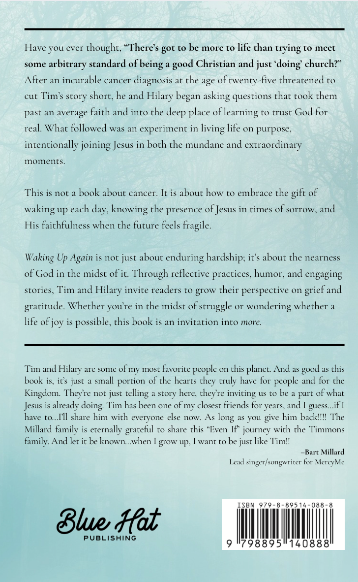 WAKING UP AGAIN is not just about enduring hardship; it’s about the nearness of God in the midst of it. Through reflective practices, humor, and engaging stories, Tim and Hilary invite readers to grow their perspective on grief and gratitude. Whether you’re in the midst of struggle or wondering whether a life of joy is possible, this book is an invitation into more.